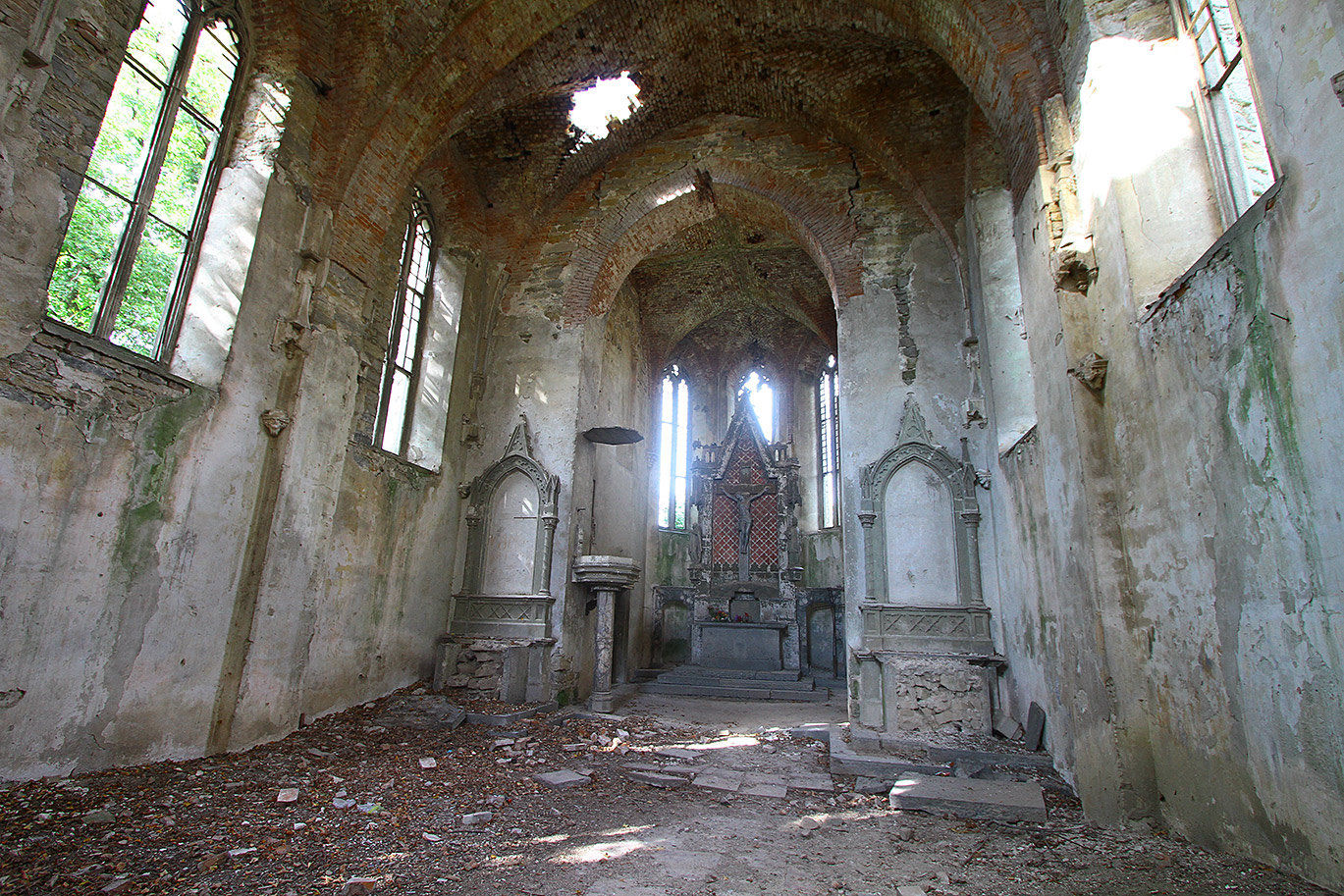 Пара сіл Збручанське — Чорнокозинці дуже цікава, але майже недосяжна. Те, що веде сюди, дорогами назвати важко. Неймовірне бездоріжжя — але ж рештки замку кам’янецьких єпископів та остов костелу св. Йосипа у Чорнокозинцях і найстаріший мурований храм Тернопілля у Збручанському (кінець XIV ст.)… Громадський транспорт ходить дуже нечасто, розклад у нього незручний, тож і це не варіант. Храм у Збручанському пережив кілька ремонтів і аж таким архаїчним не виглядає. Скромний, із товстенними стінами, невеликий — старий він. Старий. Вірте відчуттям, а не очам.