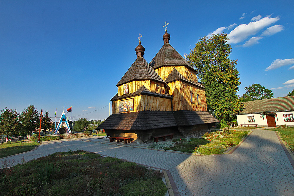 Івано-Богословська церква — типова представниця подільського стилю в народній архітектурі. Хоча ще кілька кілометрів на північ — і кінець Поділлю, почнеться Волинь. Кілька років тому зрубали старі дерева, що оточували пам’ятку. Без них церква ніби гола. Якщо церква відчинена — вам дуже пощастило: всередині бароковий шестиярусний іконостас. Переказ стверджує, його доставили сюди на волах з Києва за наказом Богдана Хмельницького. Позолотили іконостас у 2000 році не без спонсорської допомоги Леоніда Кучми. Місцевий «Страшний суд» — пізньосередньовічне унаочнення жахів пекла для неписемних вірян — зберігається у Львові.