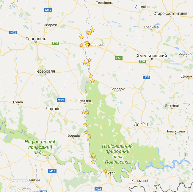 Південніше Сатанова дороги віддаляються від Збруча. Через Закупне (поруч з селом крутезний шматок Медоборів) і Вільхівці знову відправляємося на Тернопільщину — в Гусятин, останній райцентр на Збручі і малу батьківщину Северина Наливайка. Від замку і ратуші тут нічого не лишилося. Що є? Замурзана євроремонтами оборонна Онуфріївська церква (XVI ст.); синагога в мавританському стилі приблизно того ж часу (у ній колись був музей, а зараз експонується руїна і запустіння); бернардинський костел Діви Марії (XVII ст.) в процесі нескінченного ремонту — та будинки Українського народного дому та товариства «Сокіл» початку ХХ століття.
